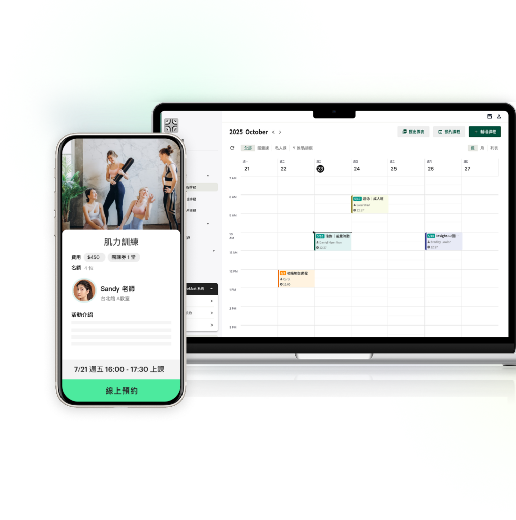 教練、老師用手機即可線上管理當月排課、點名、查業績,所有資訊同步後台。